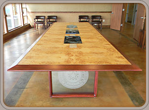 This striking curly maple veneer and mahogany conference table features the company logo sandblasted into tempered glass legs. The table top has 3 sandblasted glass inlays, each representing an aspect of the organizations mission. At 16? long and 4? feet wide, it makes an impressive statement about the client for which it was designed.